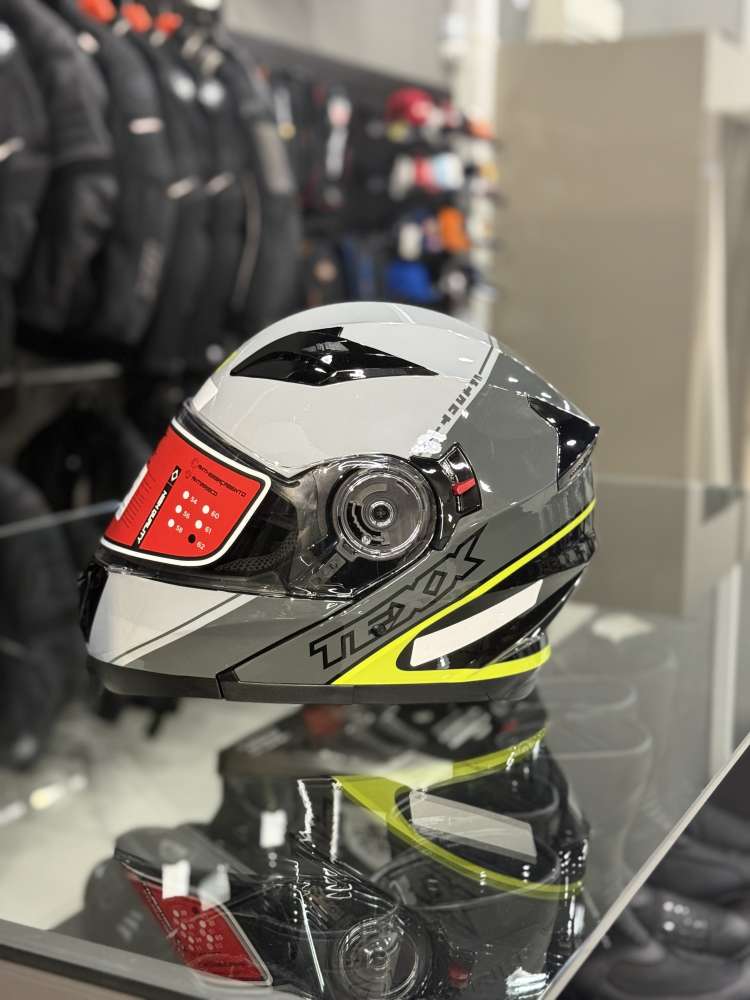 Com frente escamoteável, o capacete TEXX Gladiator V3 possui viseira externa e solar interna com acabamento antirrisco, antiembaçamento e com proteção UVA/UVB. O forro interno é produzido com moléculas de prata antifungo e antibactéria.